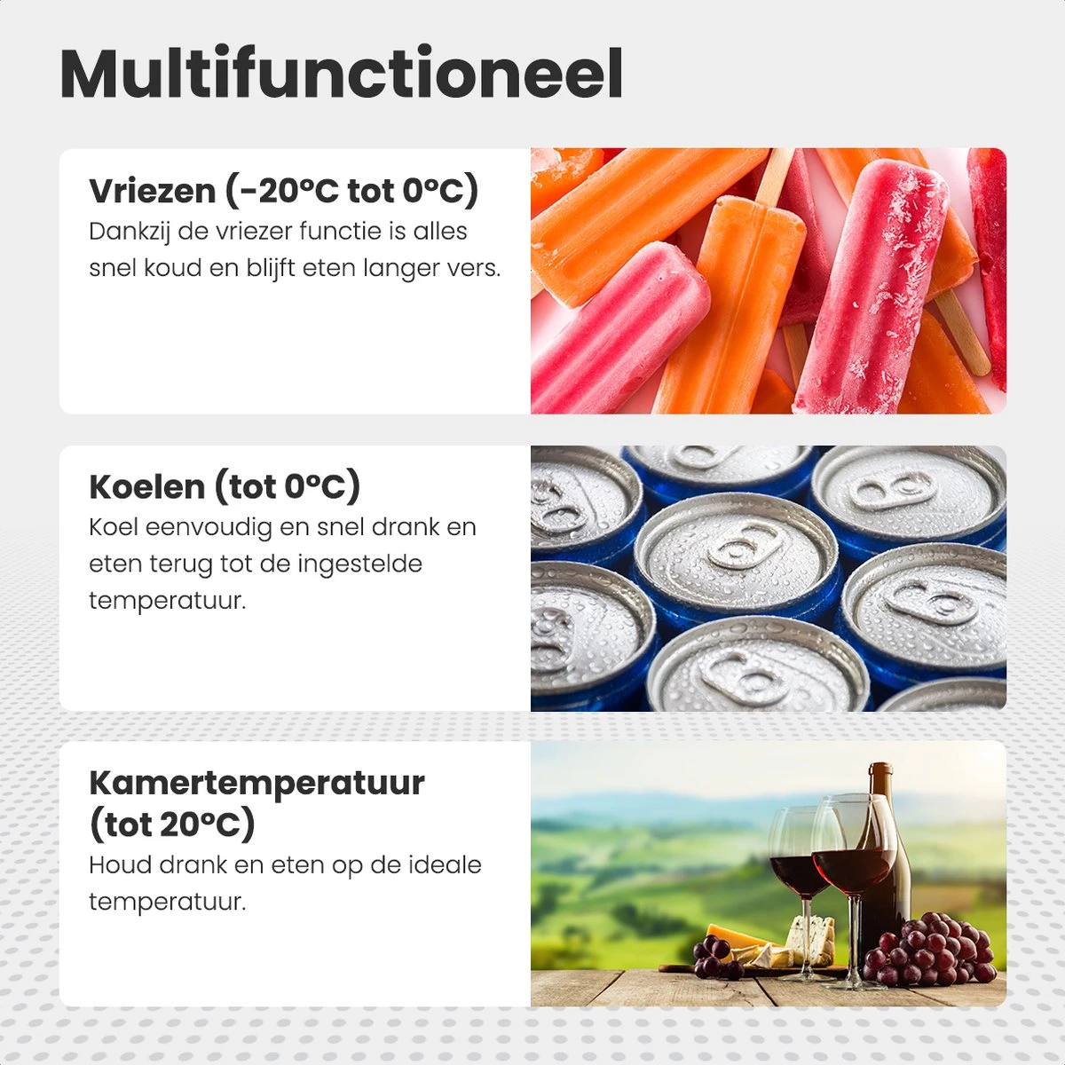 - Standen: Vriezer, Normaal, Koud, Eco en Max