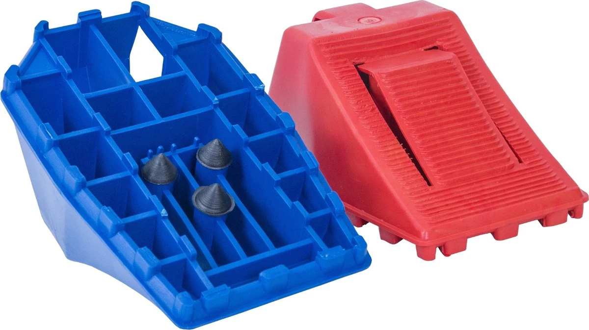 Ze zijn compact en gemakkelijk te bouwen en nemen niet veel plaats in de kofferruimte in, zodat elke chauffeur ze altijd paraat kan hebben. Aan de basis van elke wig bevinden zich speciale intrekbare spikes die de stabiliteit en de veiligheid van het op een steile helling geparkeerde voertuig verbeteren, alsook wanneer het op een krik wordt gehesen. Dankzij hun unieke structuur zijn de sleehakken volledig functioneel in alle weersomstandigheden.